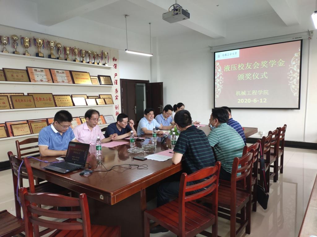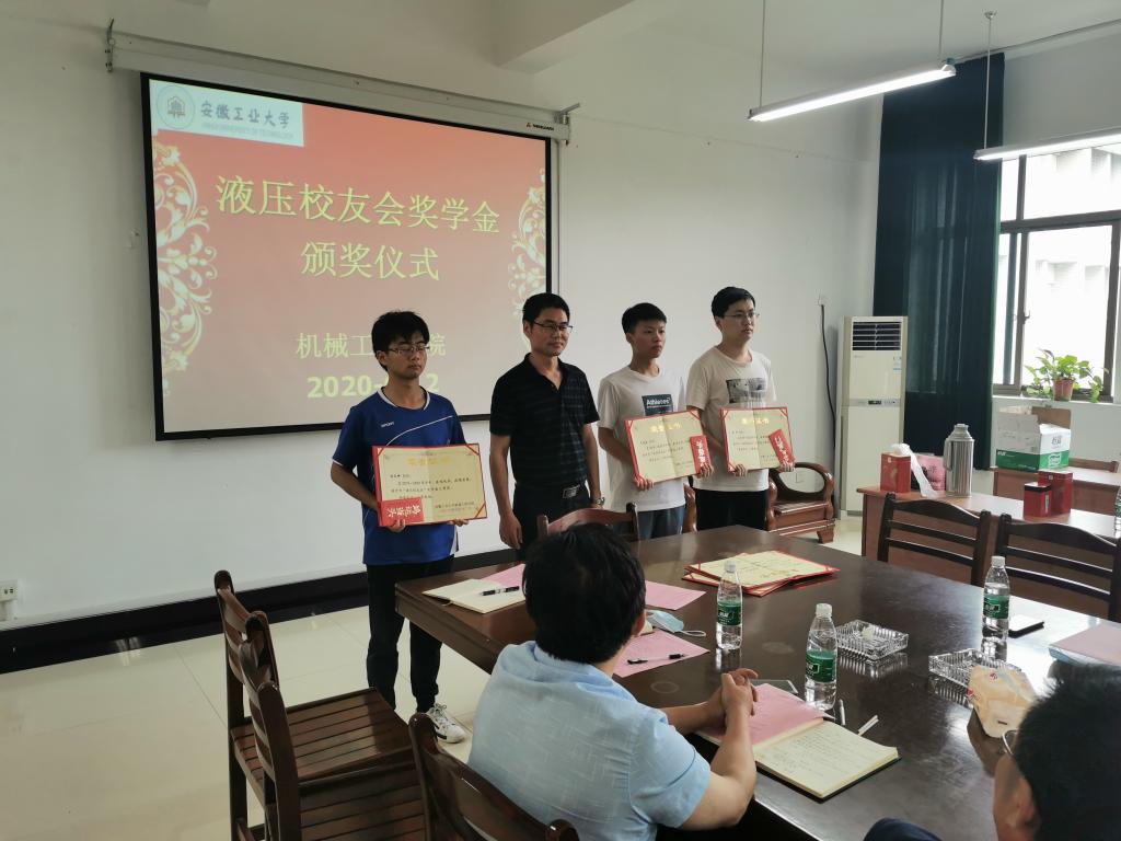 6月12日上午10时,9999js金沙老品牌2020年液压校友会奖学金颁发仪式在机械楼302会议室举行。党委书记徐柳根、副院长李克明、副院长汪永明、院机自党支部书记王刚、院团委副书记费白露、校友代表朱钱有明、戴本俊、叶兴海等出席颁奖仪式,仪式由2016级机械设计制造及其自动化专业液压方向本科生辅导员董春辉主持。