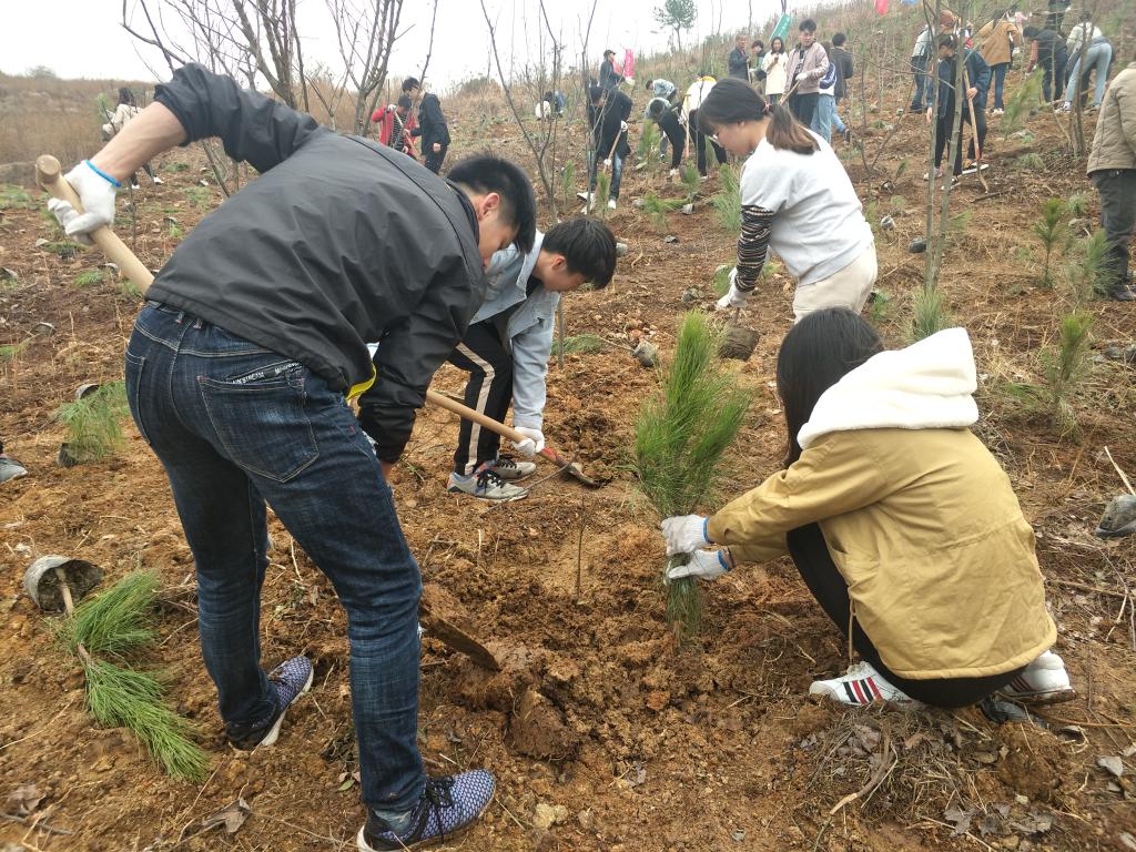 挖坑,捣土,放苗,踩实,同学们分工合作,忙的不亦乐乎。望着一棵棵绿色小树苗渐渐布满秀山校区的山头,喜悦之情难以言表。