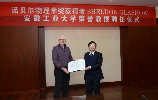 3月4日,诺贝尔物理学奖获得者、美国哈佛大学教授谢尔登•格拉肖(SheldonLeeGlashow)博士应邀来我校讲学并被我校聘为荣誉教授。校长魏先文、副校长顾明言会见了格拉肖教授。安徽省科技厅引进国外智力与科技人才管理处副处长刘涛,国际合作与交流处、数理科学与工程学院、科研处等有关单位负责人参加了聘任仪式。