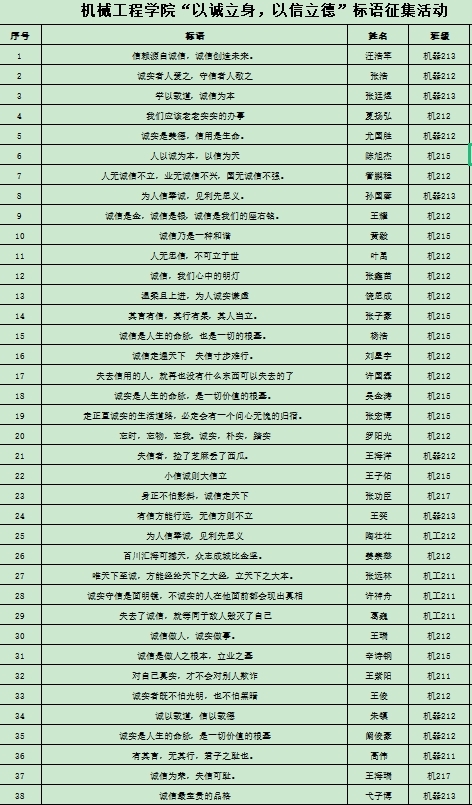 全院师生积极响应,踊跃组织参加,征集而来的标语络绎不绝,共收到原创标语116条,每一位参与者都用自己的真情文字表达自己的真切心声,有铿锵有力的誓词,底蕴十足的诗句,语气婉转的劝告,耳熟能详的警示,通俗明了的口语……每个标语作品用词简洁明了,朗朗上口,易于传颂,不仅展现了同学们的才华,也通过活动参与增强了诚信意识。经过层层评选,车212唐伯虎的“最终谎言人生无法开出灿烂鲜花”,机器211周建国的“失去了真,同时也失去了美”,机215孔溪溪的“美丽的外貌终究老去,唯有诚信的信念得以永存”及机216陶斯雨的“以诚为花,绽放信仰芬芳”这4条标语因立意深刻,被评为优秀诚信标语。(撰稿:费白露 张敏 审核:李克明)