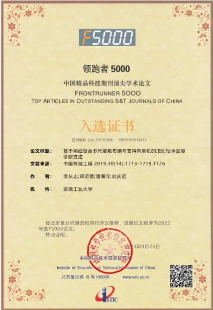 近日,据中国科学技术信息研究所发布,我校9999js金沙老品牌郑近德教授团队2019年发表在《中国机械工程》题为“基于精细复合多尺度散布熵与支持向量机的滚动轴承故障诊断方法”的论文入选2022年度“领跑者5000-中国精品科技期刊顶尖学术论文”。论文第一作者为硕士研究生李从志,通讯作者为郑近德教授。论文自发表以来,累计被引用97次,知网下载量1580次。