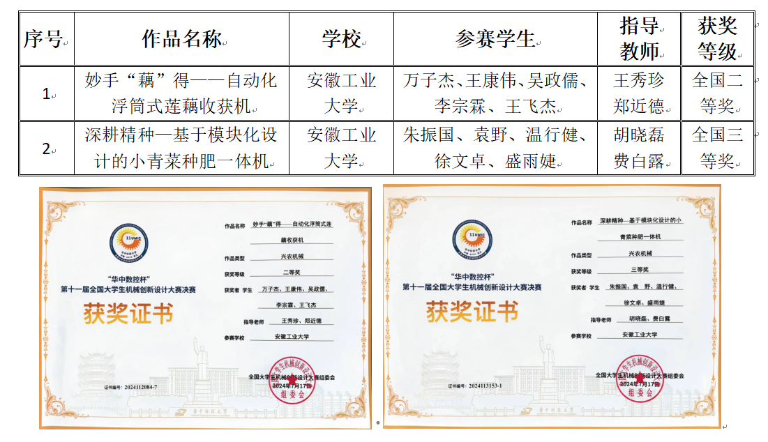 经过激烈角逐,我校万子杰等人的《妙手“藕”得——自动化浮筒式莲藕收获机》(指导教师:王秀珍、郑近德)荣获国赛二等奖,朱振国等人的《深耕精种-基于模块化设计的小青菜种肥一体机》(指导教师:胡晓磊、费白露)荣获国赛三等奖。此外,本次竞赛另有2件作品获得安徽省赛一等奖,4件作品获得安徽省赛二等奖,5件作品获得安徽省赛三等奖。